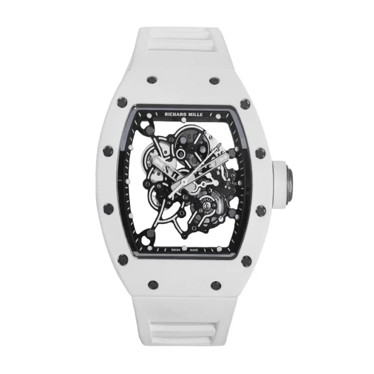 The Richard Mille RM 055 is a luxury sports watch launched in 2012, created in collaboration with professional golfer Bubba Watson. It features a tonneau-shaped case made from high-tech materials like titanium and carbon, ensuring durability and comfort. The skeletonized dial reveals the manual-winding caliber RMUL2 movement, designed to withstand extreme shocks and provide a 55-hour power reserve.