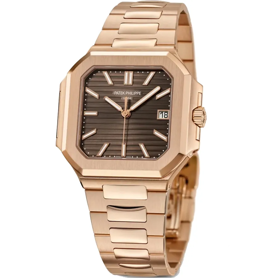 The Patek Philippe Cubitus 7128/1R-001 is a perfect blend of timeless elegance and modern sophistication. Crafted entirely from 18k rose gold, this watch features a refined 40 mm case with a slim 8.5 mm profile — designed to sit comfortably on the wrist while exuding quiet confidence. The sunburst brown dial plays beautifully with light, offering a warm contrast to the polished rose-gold finish.