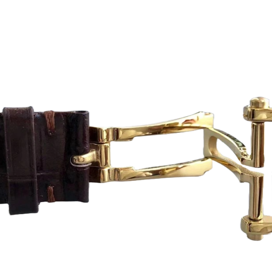 The yellow gold-toned dial features minimalist stick indices and hands, both crafted from polished 904L stainless steel. Paired with a brown leather strap and a yellow gold-tone folding clasp, the fit is both secure and sophisticated—adjustable just like the original model.