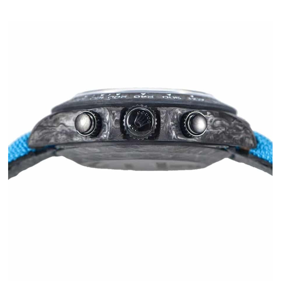 Crafted with a 904L stainless steel case featuring a forged carbon color, this 40.00 mm timepiece boasts robustness and a commanding presence on the wrist. The sapphire crystal ensures that the dial remains scratch-free and clear, giving the watch an everlasting pristine look. The fabric bracelet, adjustable to fit any wrist comfortably, is secured with a 904L stainless steel pin buckle clasp, harmoniously blending blue and black hues, adding an athletic yet sophisticated elegance.