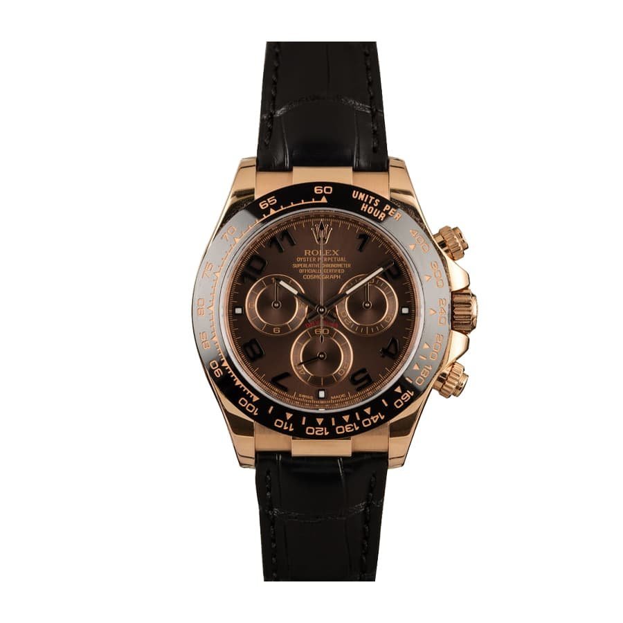This Rolex Daytona Cosmograph 116515LNBR Rose Gold Black Dial Replica is a stunning watch. It features a 904L stainless steel case with a rose gold color and a black bezel. The sapphire crystal is 40.00 mm in size and 13.00 mm in thickness. The crocodile skin bracelet is adjustable and features a double-fold clasp in rose gold. The brown dial has Arabic numerals and 904L stainless steel hour markers and hands.
