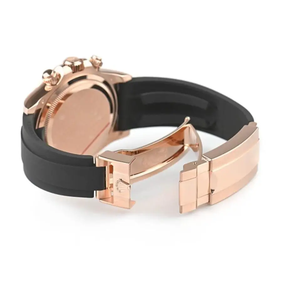 The refined black dial showcases polished Everose-tone hour markers, luminous accents, and perfectly replicated subdials that echo the racing heritage of the Daytona line. The layout maintains excellent legibility and delivers a bold, sporty yet elegant wrist presence.