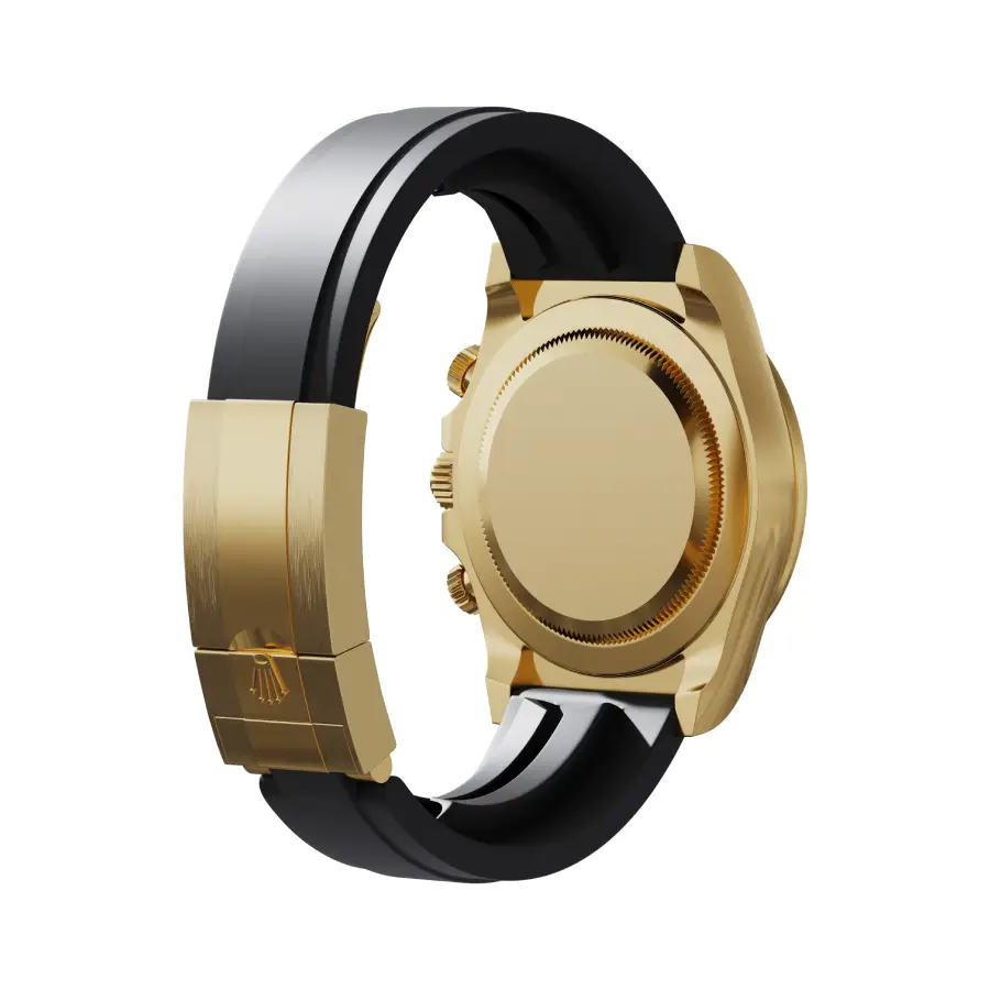The 40 mm case features a striking yellow-gold finish paired with a black Cerachrom bezel, giving the watch a bold, sporty, and elegant aesthetic. Its Oysterflex rubber strap enhances comfort and durability, while the secure Rolex clasp ensures a perfect fit for everyday wear. Sapphire crystal protection completes the premium construction.