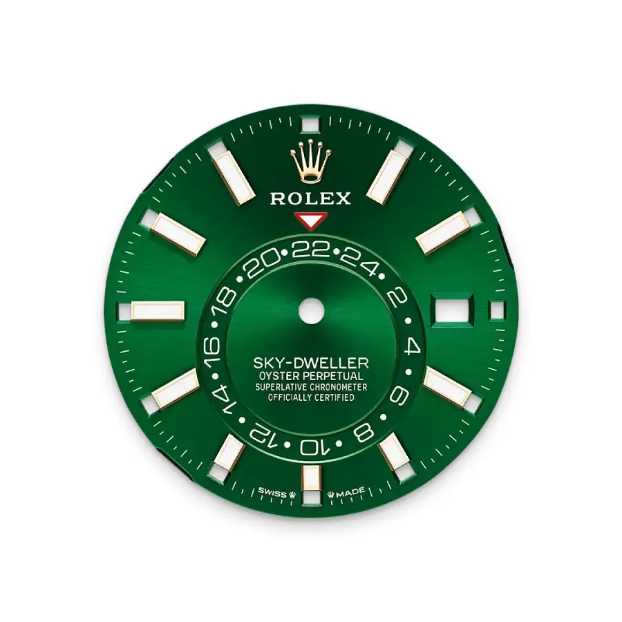 Its beautifully detailed dial showcases the Sky-Dweller’s signature off-center 24-hour ring, annual calendar display, and luminous hour markers. Combined with the fluted bezel design, the watch delivers a powerful presence and an unmistakable Rolex identity.
